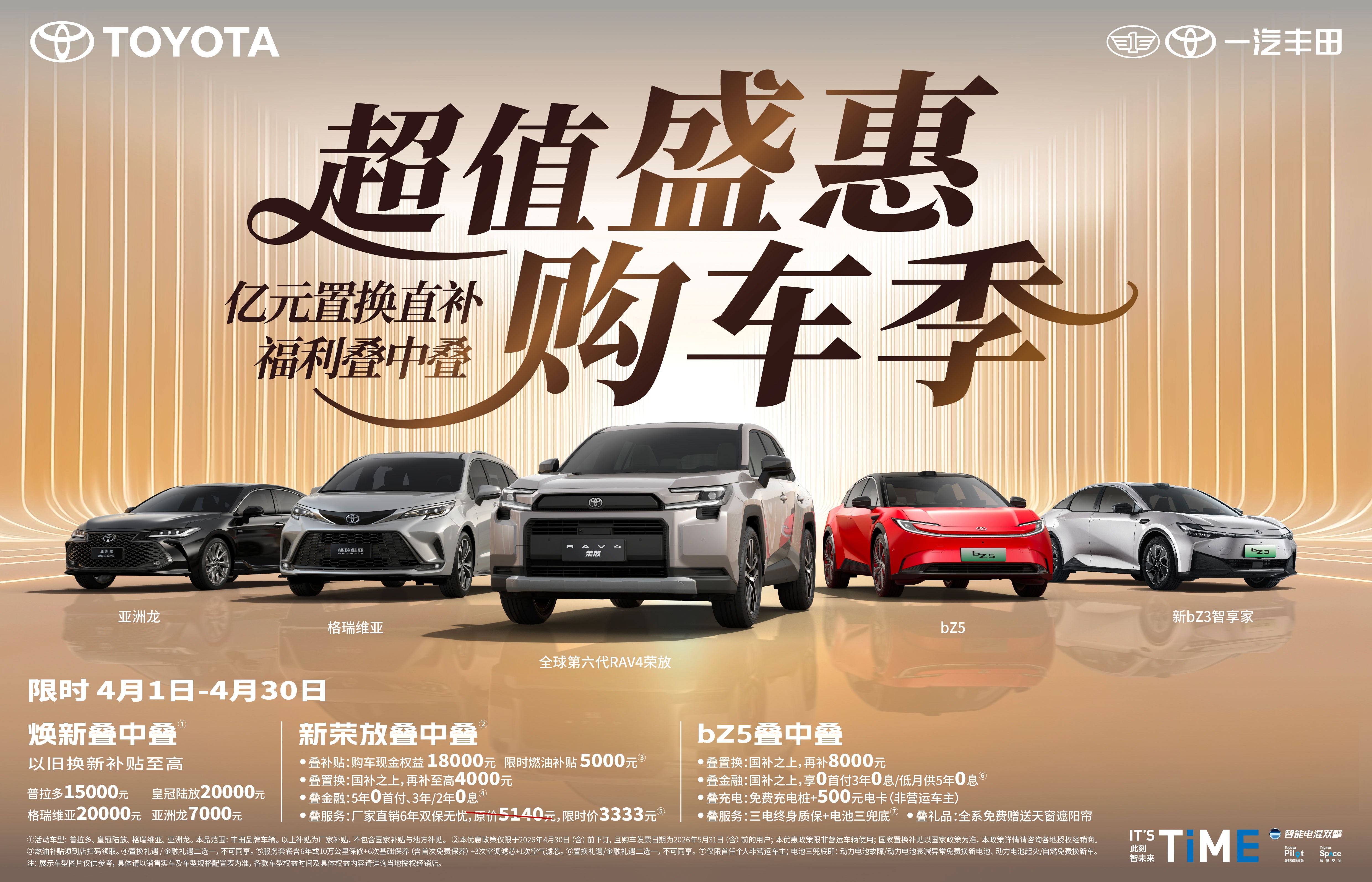 不负春日好时光,一汽丰田超值盛惠购车季同步开启,亿元置换直补福利叠加,诚意满满敬献广大用户。4月1日至4月30日,普拉多、皇冠陆放、格瑞维亚、亚洲龙车型,本品牌以旧换新可享至高20000元补贴;4月30日(含)前下订新荣放,且在2026年5月31日(含)前完成购车开票的用户,可享18000元现金权益+5000元限时燃油补贴,国补之上再叠加至高4000元置换补贴;也可选择5年0首付、前2年/3年0息的金融补贴(置换、金融二选一);同时还能享受厂家直销6年双保无忧服务补贴(原价5140元,限时价3333元)。